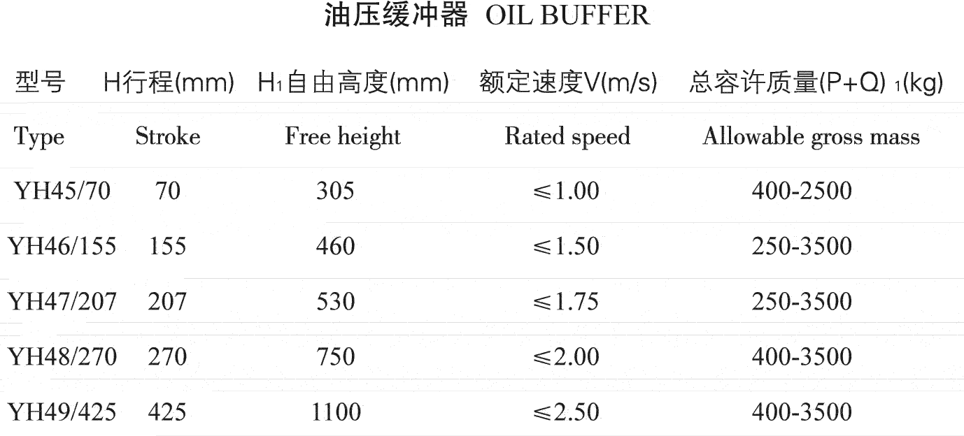 The oil buffers YH45〜YH49 are well sealed without any oil leakage, free of maintenance. They are green products. These buffers are produced and tested completely in conformity with EN81-1 and have been certificated by BSI of England and CSA of America.