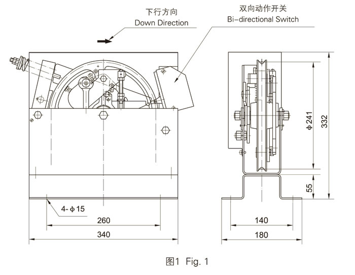 The contact switch of this governor has two groups of contact points,is bi- directional, one of which (red wire) controls the brake of traction machine, another one (blue wire) control the rope brake which is used as ascending car protection device. Please refer to Fig. 2 for wiring.