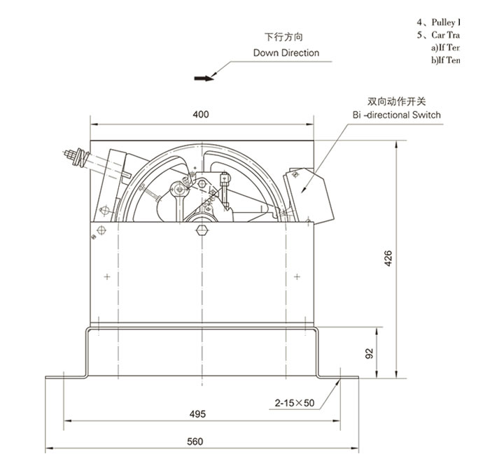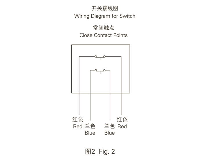 The contact switch of this governor has two groups of contact points, is bi- directional, one of which (red wire) controls the brake of traction machine,another one (blue wire) control the rope brake which is used as ascending car protection device. Please refer to Fig. 2 for wiring of switch forXS18.