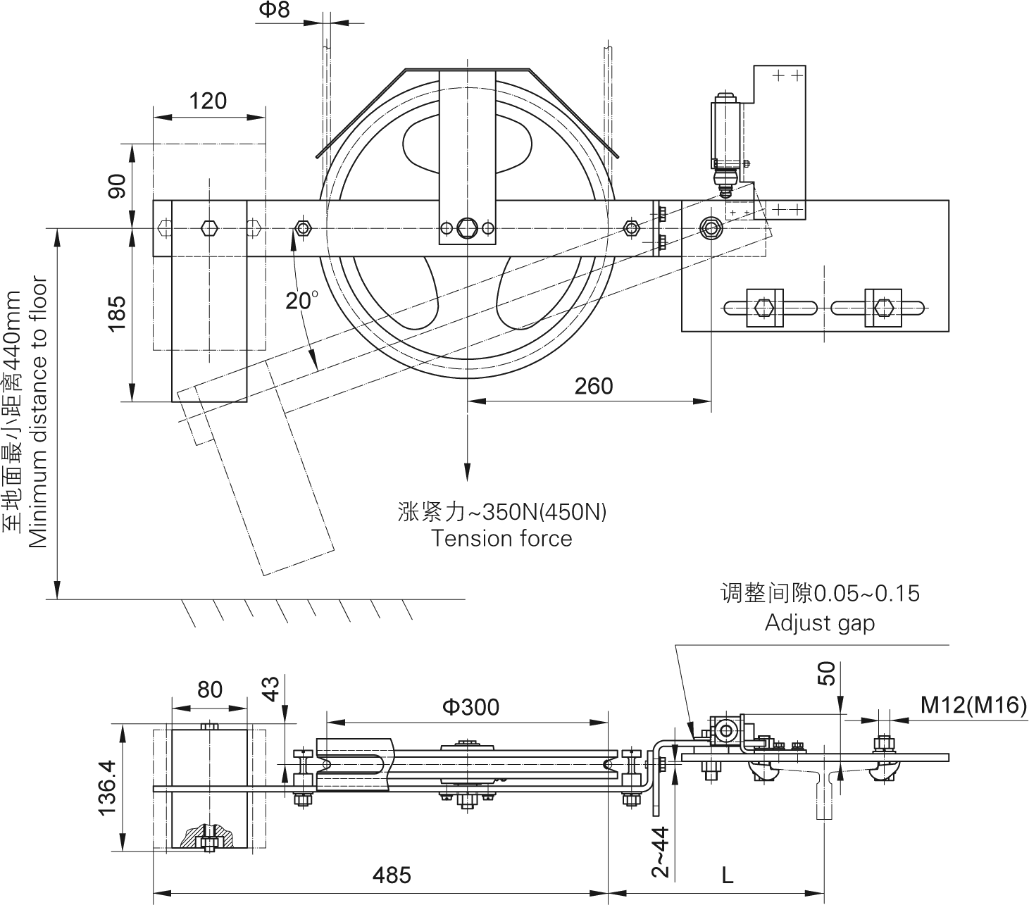 This tension device is swing arm type, and the weight is made of cast iron. Please refer to the table for the position dimension.