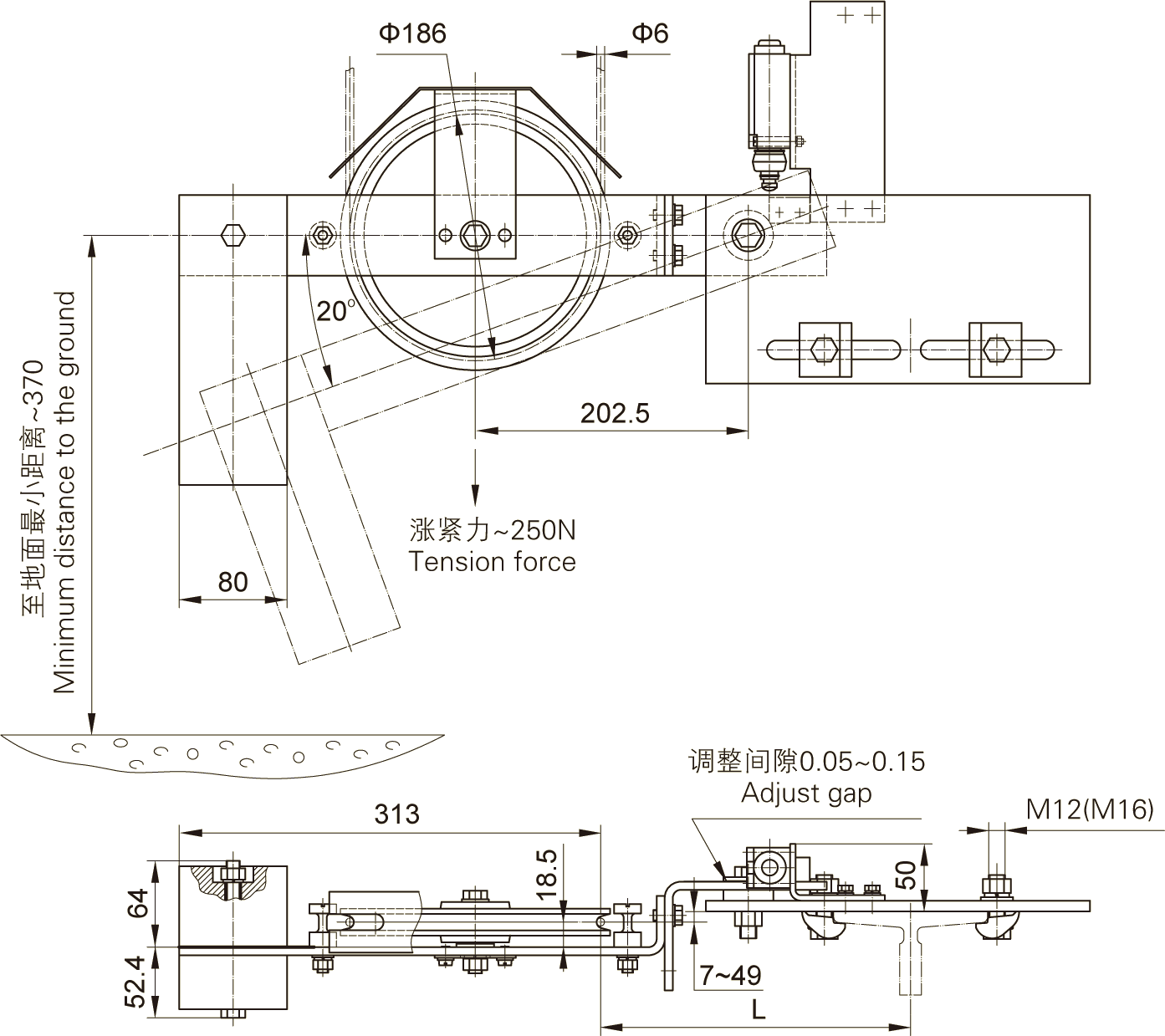 This tension device is swing arm type, and the weight is made of cast iron. Please refer to the table for the position dimension.